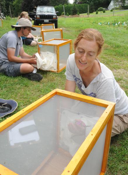 On a demonstration plot on one-half acre, biologist Lynn Adler pointed to 1,500 flowering plants of 15 varieties which researchers are inoculating with laboratory-raised parasites, crithidia. The crithidia are placed in large screen cages with common Eastern bumblebees to study the effect of different defensive plant chemicals on transmission of disease to the bees. The research is part of a broader study of diseases that are weakening native bee populations.