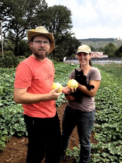 Andrew Still, holding Danish melons, and Sarah Kleeger on their seed farm in Sweet Home, Ore. (Photo: Kristin Ohlson)